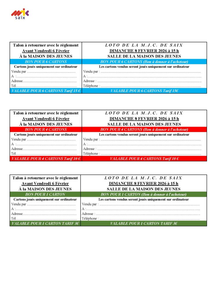 Nous retourner le talon avec le règlement (dans une enveloppe, chèque à l’ordre MJC SAIX) avant le vendredi 6 février 2026.